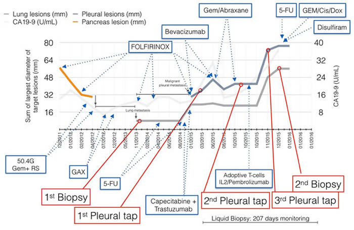 Figure 1: Patient clinical course throughout a four year period. Size of lung and pleural metastatic lesions were used to determine response to therapies (left axis). CA-19-9 levels are plotted, although remain mostly within normal range (right axis).