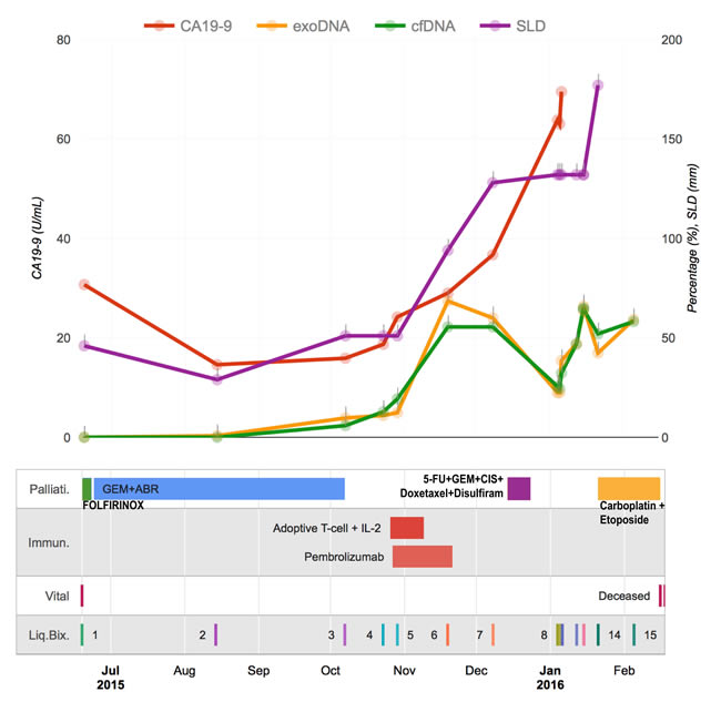 Figure 3: Treatment monitoring for a metastatic PDAC patient with 15 liquid biopsies. The graph illustrates the rise and fall of molecular and clinical indicators in the context of cancer treatments.