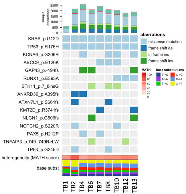 Figure 4: Heatmap of COSMIC mutations detected across tissue samples. Only those mutations present in at least two distinct lesions were considered based on a consensus approach. TB1 and TB2 corresponds to a wedge and core biopsy acquired on 12/2013 and 12/2015 respectively. TB4-TB13 are tissues acquired from rapid autopsy on 02/2016.