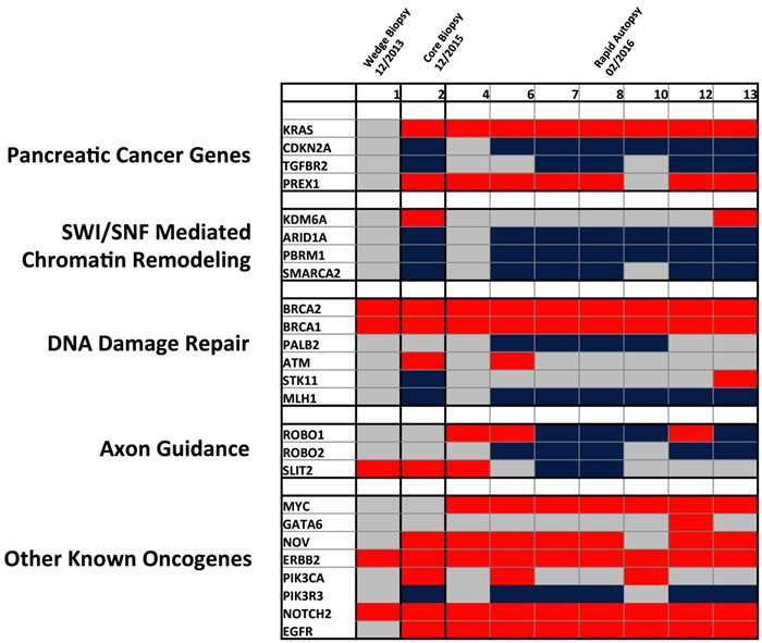 Although progression of PDAC has been suggested to occur over a period of nearly two decades, affording a window of promise for early detection biomarkers, recent studies have suggested that rather than a step-wise molecular sequence of aberrations, PDAC tumorigenesis may follow a model similar to what is termed punctuated equilibrium [5]. Specifically, it is possible that most mutations accrue in an extended phase under pre-neoplastic tumor development, but a single transformative event, which may be influenced by genomic instability from copy number variations (CNVs), induces a transformative effect facilitating overt metastasis. This underlies the functional importance of CNVs in the PDAC tumorigenesis and potential mechanisms of therapeutic resistance. Thus, patterns of copy number evolution were studied over time to determine if these events were related to disease status. As depicted in Figure 6, significant heterogeneity of copy number changes is present among previously identified PDAC related core signaling pathways [1, 6-8]. CNVs present in the initial wedge biopsy appear to be rare among PDAC related core pathways, although it is important to note the identified amplification in ERBB2, which led to targeted therapy selection using Trastuzumab, to which the patient did not respond. Subsequent tissue profiling through a core biopsy showed that the patient’s tumor harbored amplification and overexpression in the EGFR gene, potentially providing a resistance mechanism to this therapy.