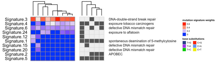 Figure 7: Mutation patterns were defined for each tumor sample using inferred exome sequencing mutations. These signatures were then decomposed into putative combinations of known mutation signatures (using COSMIC mutation signatures), where signatures 3, 4 and 6 were highly prevalent across the tissue samples and have previously been associated with deficiencies in DNA-double-strand break repair, exposure to tobacco carcinogens and defective DNA mismatch repair respectively.