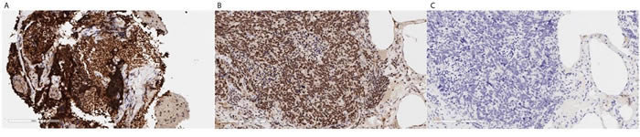 Figure 8: A. The biopsy is a CNB with a lot of crush artifact, but PARP IHC seems strongly positive as compared with a known positive control of a human SCLC. B. (Thermo cat# RB-1516-P, rabbit polyclonal, 1:100). Panel C. represents a negative control without primary antibody.
