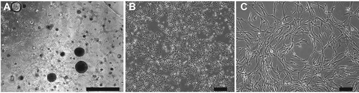 Figure 9: Isolation of hM1 cultures from a lung metastasis. hM1 cancer cells were isolated and grown as a three-dimensional organoid A., and adapted to monolayer culture B. Cancer associated fibroblast (hM1-CAF) were isolated as a monolayer culture C. (Scale bars = 200 µm).