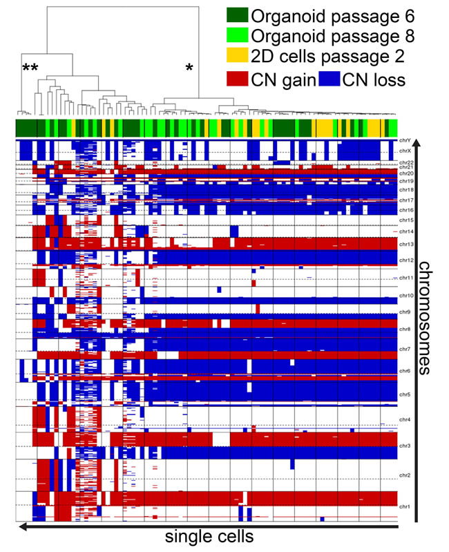 Figure 11: hM1 DNA copy number analysis heatmap. Single cells derived from organoids at passage 6 and 8, and from monolayer culture at passage 2 were analyzed for DNA copy number (CN) gain or loss. The predominant clonal features appear in all three cultures (*), while normal-like cells are only present in early passages of the organoid cultures (**).