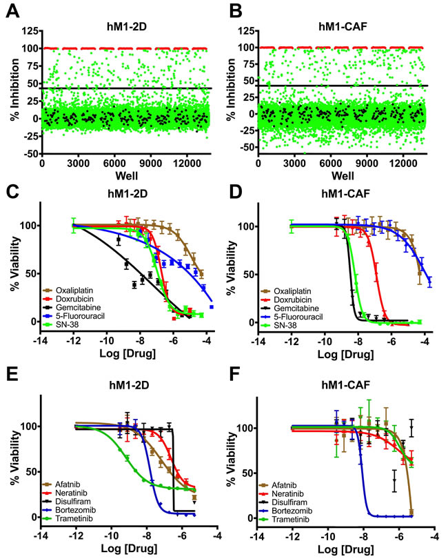 Figure 13: High throughput therapeutic screen of hM1 cells identifies high efficacy targeted inhibitors. Growth inhibition effect in hM1 cancer cell line A. and in cancer associated fibroblasts B. in response to 3200 approved agents. Dose response curves for cytotoxic chemotherapeutics C. and D. and selected targeted inhibitors in therapeutic screen E. and F.