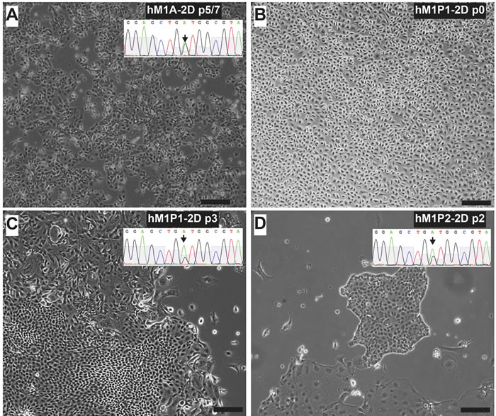 Figure 14: Thoracentesis-derived cell lines hM1P1 and hM1P2 contain KRAS-G12D genetic lesion. Lung metastasis-derived hM1A-2D A. is show next to thoracentesis-derived hM1P1-2D and hM1P2-2D cell lines C. & D. All three cell lines contain the KRAS-G12D mutation (targeted sequencing of KRAS shown in inset). When received from the clinic, the pleural effusion contained a majority of mesothelial cells B. (Scale bar = 200 µm).