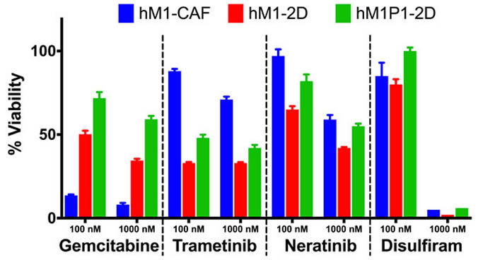 Throughout the clinical care of the patient, repeated biopsies allowed generation of additional organoid and cell line cultures. Two independent thoracenteses were performed at the Washington University Hospital in St. Louis and at MD Anderson in Houston (early 2015). The Cold Spring Harbor Laboratory team received a pleural effusion sample from each medical institution and generated two hM1P (pleural) organoid and monolayer cell lines (Figure 14). They observed that Trametinib, Neratinib, and Disulfiram maintained their activity in the newly generated hM1P cell lines, whereas the chemotherapeutic gemcitabine was now less active, hinting at an acquired resistance to ongoing therapy (Figure 15).