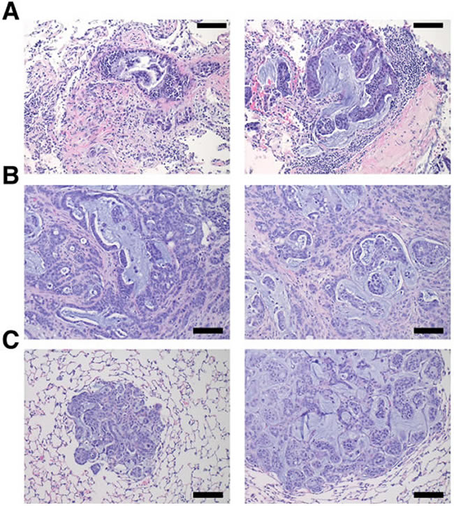 Figure 16: hM1 orthotopically grafted organoid (OGO) recapitulate human tumor histopathology. Two representative H&E images of the patient’s lung metastatic tissue A. compared to large desmoplastic and mucinous mouse pancreatic tumors B., and mouse lung metastases C. (Scale bar = 100 µm).