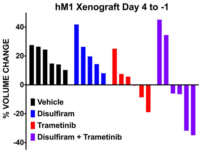 To validate targeted therapeutic strategies, the CSHL team generated hM1A mouse xenografts. The genetic alterations present in hM1 organoids, such as the KRAS-G12D and TP53-R175H mutations, render hM1A cells very aggressive when transplanted orthotopically into the pancreas of immunocompromised mice (Figure 16). Large desmoplastic tumors grew in the pancreas of the mice, and a high frequency of lung metastasis with remarkable recapitulation of the histopathology of the primary metastatic tissue was observed (Figure 16). The acquired resistance to chemotherapy seen in hM1P cells highlighted the need for targeted therapeutic options for the patient, therefore, a subset of regimens in the hM1A orthotopic xenografts was tested. The regimens tested included Disulfiram, Trametinib, and the combination of both agents (Figure 17). Whereas single agent Disulfiram did not induce a tumor regression, the MEK inhibitor Trametinib did lead to tumor regression in 2/6 mice. The combination of both agents led to the largest effect on tumor burden, with more substantial tumor regressions observed in 4/6 mice, indicating that potentially these compounds could have been beneficial to the patient. Yet, some mice did not respond to the combination (2 out of 6), highlighting the possible impact of oligoclonality on therapeutic response.