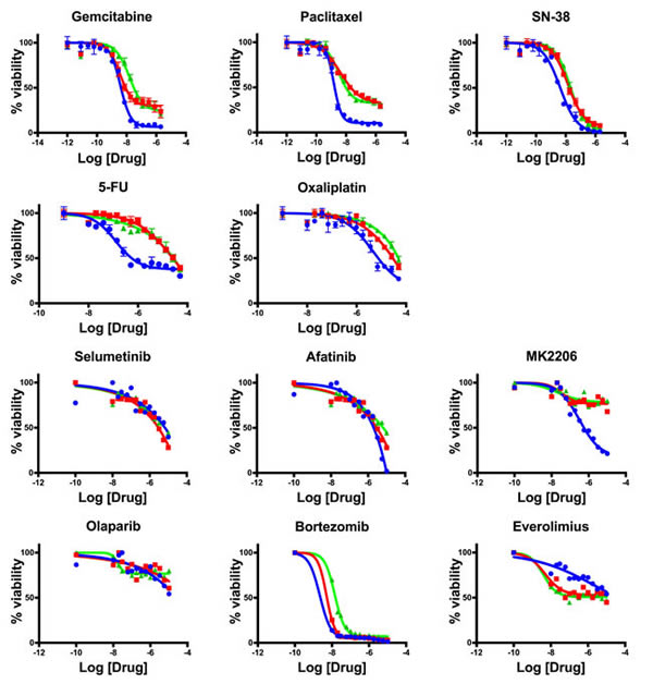 Figure 18: Therapeutic testing of hM1 organoid cultures. Dose response assay with hM1A (blue lines), hM1E (red lines), and hM1F (green lines) organoids, for chemotherapeutic agents and targeted agents.