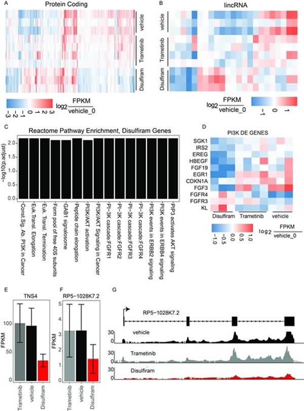 Figure 19: Transcriptional analysis of top drug targets. A. Significantly dysregulated mRNA genes in either Disulfiram-vehicle or Trametinib-vehicle. Log2 fold change of each replicate is shown relative to vehicle replicate 0. B. Significantly dysregulated lincRNA genes. Log2 fold change of each replicate is shown relative to vehicle replicate 0. C. Reactome gene ontology enrichment (BH adjusted p-value < 0.01) for genes significantly dysregulated in disulfiram samples. D. Log2 fold change of PI3K pathway genes in each sample relative to vehicle replicate 0. E. Expression in FPKMs of TNS4. F. Expression in FPKMs of lincRNA RP5-1028k7.2. G. Raw RNAseq read pileup across the RP5-1028k7.2 locus, with gene structure shown above.