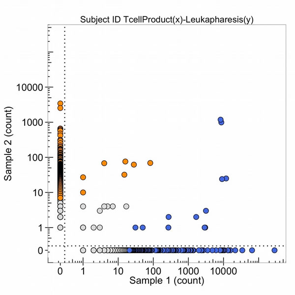 Figure 21: The number of DNA sequence reads of T-cell receptors from the T-cell product of the peptide amplification of the total leukapharesis (sample 1) and from the leukapheresis (sample 2). The high clonal counts of T-cell receptor sequences from the T-cell product of peptide expansion (in blue) and the leukapharesis (in orange) are presented and the sequences that are high clonal DNA sequence reads in both samples are in the upper right-hand corner.