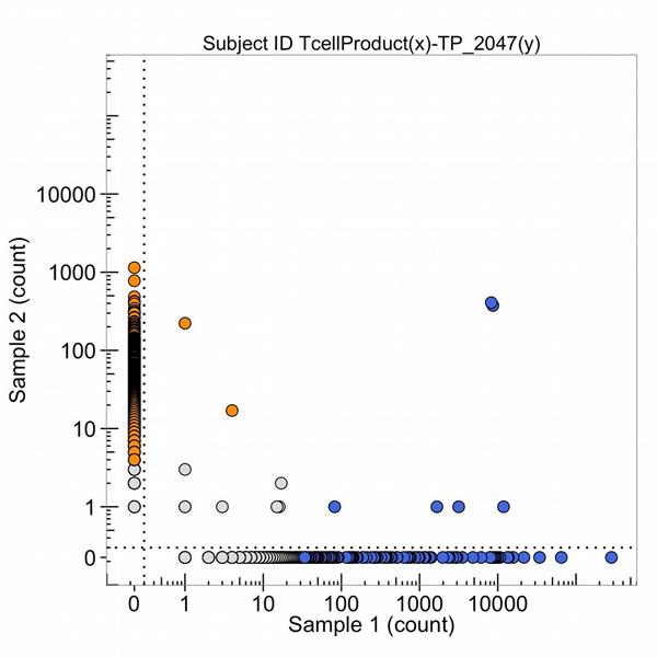 Figure 20: The number of DNA sequence reads of T-cell receptors from the total leukapheresis (sample 1) and from the metastatic lung tumor (TP_2047(y), obtained Nov. 2013) (sample 2). The high clonal counts of T-cell receptor sequences from the leukapheresis (in blue) and from the tumor (in orange) are presented and the sequences that are expanded clonally in both samples are in the upper right corner of the graph.