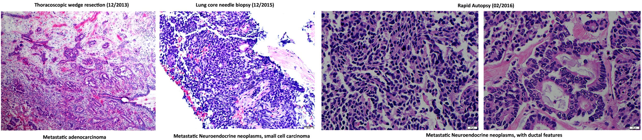 Figure 2: H&E staining of lung metastatic biopsy taken at the beginning (left) and end (middle and right) of liquid biopsy follow up. Histological analysis demonstrates a phenotypic change from adenocarcinoma to small cell-like tumor. Rapid autopsy samples show phenotypically distinct lesions comprising neuroendocrine and ductal-like histologies.