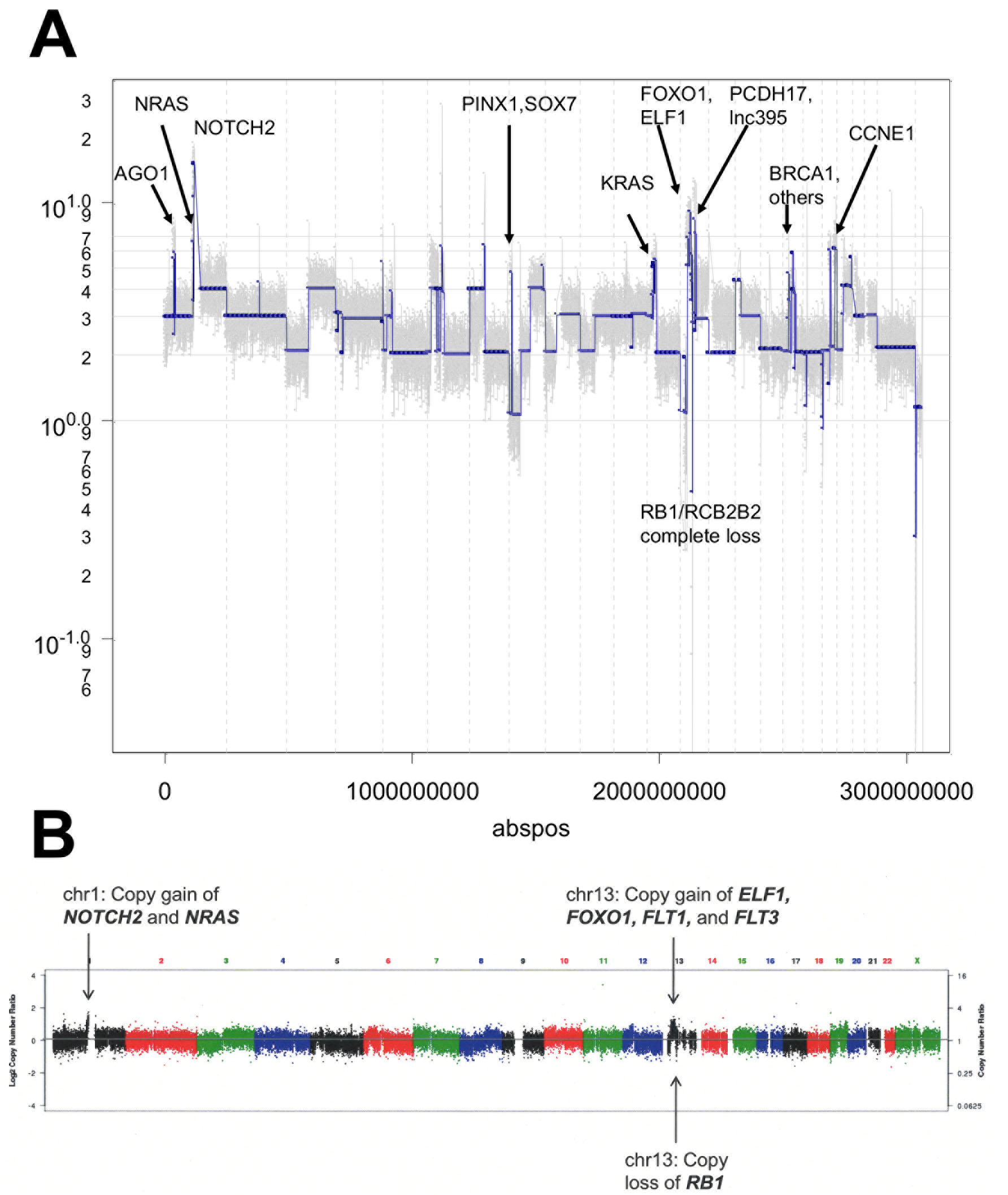 Figure 12: Copy number analysis of hM1. A. Copy number analysis of a representative single cell clone of hM1. B. Copy number of primary metastatic tissue after laser dissection (~40% neoplastic cellularity).