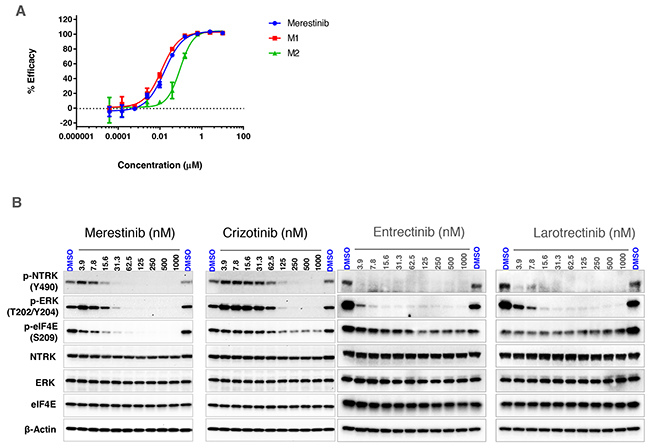 Figure 1: In vitro effect of merestinib treatment on cell-based NTRK1 inhibition. (A) Effect of merestinib and its two metabolites (M1, M2) on cell-based PathHunter TrkA inhibition. Ten-point IC50 analysis of inhibitor ranging from 3.8 nM - 10 μM was performed. (B) Western blots of KM-12 cells treated with merestinib, crizotinib, entrectinib and larotrectinib in vitro. Cells were treated with compound ranging from 3.9 - 1000 nM for 2 hours. Western blots were re-probed for total NTRK, ERK, eIF4E and β-actin for loading control purposes.