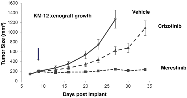 Figure 2: Anti-tumor activity of merestinib in KM-12-derived xenograft tumors. Merestinib was dosed orally once daily at 24 mg/kg (- -■- -), crizotinib was dosed orally twice daily at 25 mg/kg (- -▲- -). Dosing began in athymic nude mice implanted with KM-12 cells once average tumor burden reached 150-200 mm3 on Day 9 (denoted by arrow). Vehicle (— ◊—) dosing terminated on Day 27 as animals in this group were removed due to excessive tumor burden. Statistical analyses comparing vehicle to the two treated cohorts were performed on Day 27, and comparing crizotinib and merestinib (p<0.001) on Day 34. Animal weights were measured twice weekly with no significant weight alteration relative to vehicle.