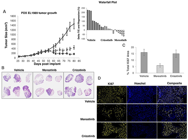 Figure 3: Anti-tumor activity of merestinib in patient-derived xenograft tumors (EL1989) bearing TPM3-NTRK1 fusion. (A) Merestinib was dosed daily at 24 mg/kg (- -■- -), and crizotinib was dosed twice daily at 25 mg/kg (- -▲- -). All treatment cohorts began dosing on Day 52. Waterfall plot depicts individual animal tumor response to treatment as measured after 28 days of dosing (on Day 80). Graph bars below the x-axis indicate tumor regression. (B) Low magnification image (6x) of hematoxylin and eosin stained EL1989 PDX tumor histological sections grouped by treatment and harvested at the end of the study: Vehicle control tumors, merestinib treated tumors, crizotinib treated tumors. Viable tumor tissue stains light to dark purple, areas of necrosis stain as pale pink and areas of mucin accumulation are very pale or lack staining. Tumor viability, tumor necrosis and mucin accumulation scoring were performed by a board certified pathologist (KMC). Estimated % viable tumor tissue per cohort are as follows: Vehicle, mean 50%, range 5-90%; merestinib, mean 25%, range 5-70%; crizotinib, mean 50%, range 5-90%. Refer to Supplementary Table 2 for individual assessments. (C) Percent proliferating tumor cells by treatment based on Ki67 immunostaining and image analysis. Merestinib treated tumors (n=6) were significantly reduced (p=0.016) relative to vehicle (n=10). Crizotinib treated tumors were not significantly different (p=0.94). Five of six merestinib treated tumors showed thin rims of viable tumor tissue located mostly around the outer perimeter in comparison to the crizotinib treated cohort that displayed tumors with more abundant viable cells distributed throughout most tumor sections. Histological sections from vehicle control tumors were performed only on portions of the whole tumors rather than whole intact samples. Of these sections, viable cells were distributed throughout the tumors similar to crizotinib treated tumors. Tissue sections were stained with Ki67, and imaged and analyzed using an iCys laser scanning cytometer. Error bars denote SEM. (D) Representative image of the Ki67 immunostaining of the tumors from vehicle control, crizotinib and merestinib treated groups.