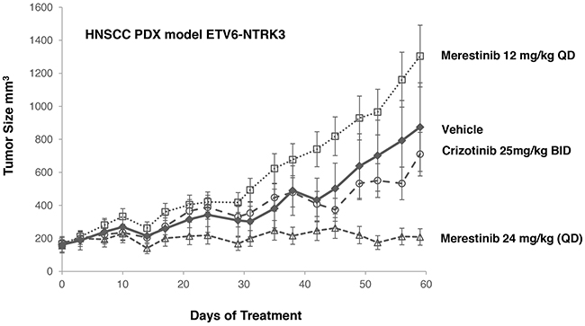 A leukemia cell line MO-91 harboring ETV6-NTRK3 gene fusion was used by others to evaluate NTRK inhibitors [9, 15]. Crizotinib was found to inhibit the proliferation of MO-91 cells in vitro with an IC50 of 10 nM [15] and induced tumor regression of the MO-91 xenograft tumors at 50 mg/kg once daily dosing [15]. As MO-91 cells are not available in publicly accessible cell banks, and the parental MO-91 cells are poorly tumorigenic [15], we elected to evaluate merestinib and crizotinib in a HNSCC PDX model also bearing ETV6-NTRK3 gene fusion (Figure 4, Supplementary Figure 5). Merestinib dosed daily at 24 mg/kg showed reduction of tumor growth relative to vehicle control (T/C=6.2%, p < 0.001) while crizotinib dosed 25 mg/kg twice daily did not show significant tumor growth reduction (T/C=76.9%, p=0.525) relative to vehicle. Together, merestinib displays potent anti-tumor effect in tumors with NTRK fusions.