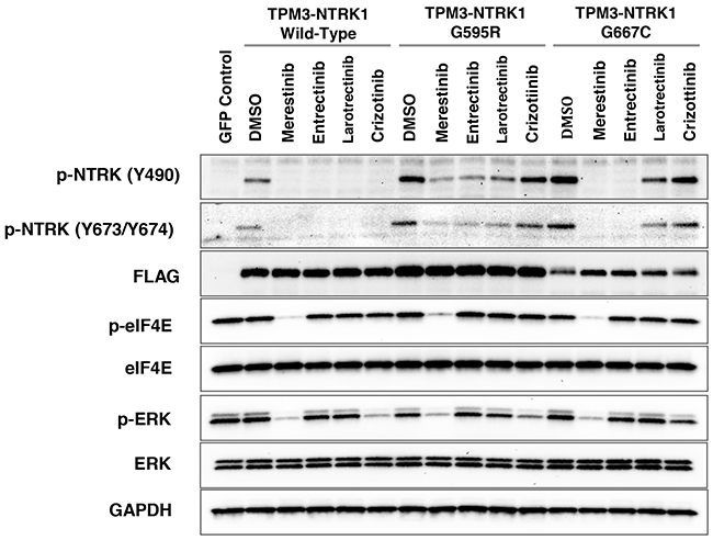 Figure 5: Evaluation of NTRK inhibitors with NIH-3T3 cells transfected with G595R or G667C mutation in TPM3-NTRK1 fusion in vitro. Cell lysates from NIH-3T3 cells stably transfected with TPM3-NTRK1 wild-type, mutant G595R, or G667C TPM3-NTRK1 expressing clones were analyzed by immunoblotting after treatment with 0.5 μM of the indicated NTRK inhibitor for 4 hours. All three TPM3-NTRK1 clones expressed 3’-3X-FLAG-Tag as confirmed by anti-FLAG antibody. eGFP control vector served as a control with no NTRK or FLAG expression.