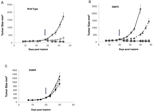 Figure 6: Comparison of anti-tumor effect of merestinib with entrectinib in vivo in tumors bearing G595R or G667C mutation. NIH-3T3 cells constitutively expressing TPM3-NTRK1 variants were implanted subcutaneously in the flank region in athymic nude mice. Once the average tumor volume reached 150-200 mm3, compound dosing was initiated: merestinib dosed orally once daily at 12 mg/kg (- -○- -), 24 mg/kg (- -■- -) or entrectinib dosed orally twice daily at 30 mg/kg (- -▲- -) for 21 days. Tumor growth of vehicle control (—♦—), merestinib or entrectinib treatment was evaluated in: (A) wild-type TPM3-NTRK1; (B) mutant G667C TPM3-NTRK1; (C) mutant G595R TPM3-NTRK1 in mouse tumor models. Arrows indicate beginning of dosing.