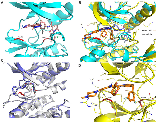 Figure 7: Comparison of X-Ray crystal structures of NTRK1 bound to merestinib and entrectinib, and structures of ALK bound to entrectinib and crizotinib. (A) Merestinib bound to NTRK1 in ribbon diagram where the protein part is in cyan and the inhibitor in pink. G595 and G667 are highlighted in red in the ribbon. Arrows are used to show key interactions between the inhibitor and protein, the blue arrow for hinge interaction, the black arrow for hydrophobic interaction in the interior pocket while the green arrow for the interaction in the pocket created from the DFG-out conformation. (B) Entrectinib (in brown) and merestinib (in blue) bound to NTRK1 (complex with entrectinib in yellow and complex with merestinib in cyan). The dramatically different conformations in the activation loop (downstream G667) arise from the DFG-in conformation with the type I inhibitor entrectinib and the DFG-out conformation with the type II inhibitor merestinib. (C) Entrectinib (in grey, PDB accession code 5fto) and crizotinib (in blue, PDB accession code 2xp2) bound to ALK to show the similar binding mode of the type I inhibitors. (D) Entrectinib bound to NTRK1 with shown close distances to G595 and G667. The short distance between G595, G667 and the inhibitor means that mutations to a bulkier residue (G595R, G667C) will disturb the bound inhibitor. Larotrectinib is also a type I inhibitor with a similar fluoro-phenyl group located near G667C and thus is expected to be sensitive to the same mutation. This is actually what was presented in a recent study [9].