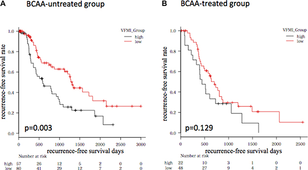 We then evaluated the impact of branched chain amino acids (BCAA) supplementation on HCC recurrence because this agent was reported to suppress HCC development in liver cirrhotic patients with obesity [15]. In the present study, 70 cases used BCAA and they showed poor liver functional reserve, e.g., the average serum albumin level was significantly low in BCAA-treated group (3.4 g/dL) compared to untreated group (3.9 g/dL, P <.0001). In BCAA-untreated group, the recurrence-free survival rate of the higher VFMI group was significantly low compared to the lower VFMI group (P = 0.003, Figure 3A). However, no significant difference was observed in the BCAA-treated group (P = 0.129, Figure 3B).