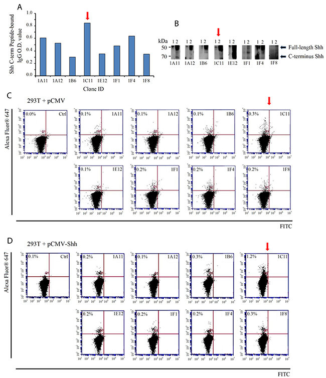 Figure 2: Screening of murine hybridoma clones for selection of candidate therapeutic anti-Shh antibodies directed at the C-terminal of the Sonic Hedgehog protein. (A) Supernatants from antibody- producing hybridoma clone cells were incubated with synthetic peptide mimics of Shh as measured by an ELISA-based assay. Clone 1C11 (red arrow) showed the strongest binding to the same Shh peptide mimics used to generate an immune response. (B) Hybridoma clonal supernatants were incubated with the following cell lysates to check for Shh protein detection and analyzed by Western blotting: 1) 293T (endogenous Shh) and 2) 293T (exogenously transfected with pCMV-Shh) (C) Flow cytometric evaluation of cell-surface Shh recognition performed with clonal supernatants incubated with non-permeabilized 293T cells containing the vector control or (D) pCMV-Shh. Clone 1C11 detected the highest percentage of cell-surface Shh compared with the other clones. The secondary antibody alone incubated with cells was run as a negative control.