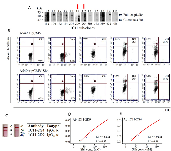 Figure 3. Characterization of 1C11 sub-clones. (A) Supernatants of 12 sub-clones derived from parental clone 1C11 were incubated with 2 different cell lysates to check for Shh epitope recognition by Western blotting: 1) 293T (endogenous Shh-vector control) and 2) 293T (exogenously transfected with pCMV-Shh) (B) Flow cytometric evaluation of Shh recognition performed with purified antibodies Ab 1C11-2G4, Ab 1C11-2D9 and a commercial (Com) C-term antibody on vector control (pCMV) A549 cells (top panel) and A549 cells transfected with pCMV-Shh (bottom panel) compared with their respective negative controls of cells incubated with secondary antibody alone (Ctrl.). (C) Two sub-clones of 1C11, 2G4 and 2D9, exhibit IgG1, kappa measured using an isotyping kit. Binding affinities (Kd) of antibodies Ab 1C11-2D9 (D) and Ab 1C11-2G4 (E) for recombinant Shh protein.
