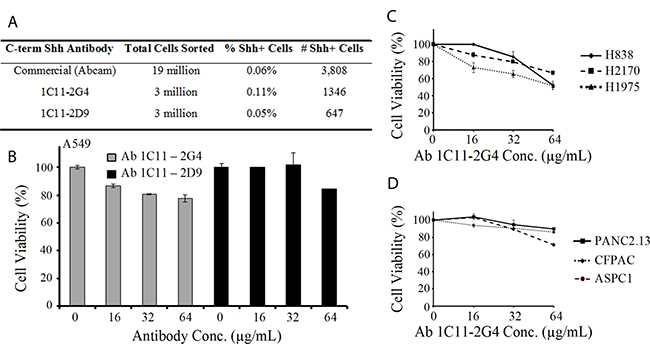 Figure 4: Anti-Shh antibodies directed at the C-terminal of the Sonic Hedgehog protein recognize Shh+ cell populations and reduce cell viability of cancer cells in a dose-dependent manner. (A) Fluorescence Activated Cell Sorting (FACS) of A549 cells labeled with Ab 1C11-2G4, Ab 1C11-2D9 and commercially purchased (Abcam) anti-Shh antibodies showing the % and number of Shh+ cells sorted. (B) NSCLC A549 cells were treated with indicated doses of C-term anti-Shh 1C11-2G4 and 1C11-2D9 antibodies (reconstituted in PBS) in triplicate for 96 hours and cell viability/ATP content was measured using CellTiter-Glo Luminescent Cell Viability Assay. PBS was used as a negative control. The results shown for all cell viability figures are representative of two independent experiments. Error bars indicate means ± S.D. Effect of Ab 1C11-2G4 on cell viability in lung cancer (C) and pancreatic cancer (D) performed as in (B).