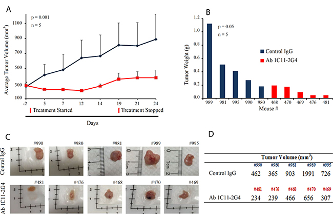 Figure 5: C-term Shh Ab 1C11 – 2G4 treatment inhibits in vivo growth of NSCLC in a mouse xenograft model. (A) 7-week-old female nude mice were inoculated with 10 × 106 NSCLC A549 cells in the flank region to establish tumors and randomly assigned to treatment regimens of IgG control or Ab 1C11-2G4 (8 mg/kg × 3 times a week for 3 weeks, intratumorally). Changes in tumor volume of mice treated with the antibodies IgG control or Ab 1C11 – 2G4 (n = 5, p = 0.001) over the course of the study are shown. At the end point, tumor mass (B) was determined on harvested tumors by weighing (n = 5, p = 0.05). (C) Images of tumors collected from antibody-treated mice with their identifying ear-tag mouse numbers (#) showing a clear reduction in tumor volumes (D) calculated using the formula (V = L × W2) in Ab 1C11 – 2G4-treated mice when compared with the control IgG antibody.