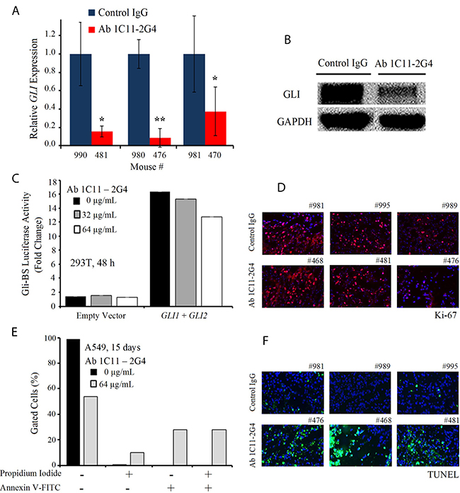 Figure 6: C-term Shh Ab 1C11–2G4 treatment down-regulates Gli and induces apoptosis. (A) Ex vivo quantitative RT-PCR analysis of GLI levels in A549 harvested tumors treated with IgG controls OR 8 mg/kg Ab 1C11-2G4, 3× per week for 3 weeks. Real-time PCR reactions were performed in triplicate and the data presented as fold change in target gene expression (mean ± SD) after normalization with GAPDH. The results shown are representative of two independent experiments. (B) Corresponding tumors after control IgG OR Ab 1C11-2G4 treatments were lysed and analyzed by Western blot for the expression of GLI. GAPDH was used as a loading control. (C) Empty vector OR GLI1 and GLI2-induced transcriptional activation in 293T cells left untreated or treated with 2 doses of Ab 1C11-2G4 for 48 hours. An expression construct linking the 8 repeats of Gli-binding sites (Gli BS) to a luciferase reporter was used as a surrogate measurement of the Gli-dependent transcription. All measured luciferase activities were normalized to pRL-TK vector activity. The data represent means ± S.D. (D) Control IgG- or Ab 1C11-2G4-treated tumor sections stained for a common proliferation marker, Ki-67. Representative images captured at 20× are presented. (E) A549 cells were treated with 64 μg/mL of Ab 1C11-2G4 for 15 days, stained with Annexin V-FITC/PI and analyzed for apoptosis by flow cytometry. The resulting percentages are presented as a graph. (F) Control IgG- or Ab 1C11-2G4-treated tumor sections stained for apoptosis induction via a TUNEL assay. Representative images captured at 20× are presented.