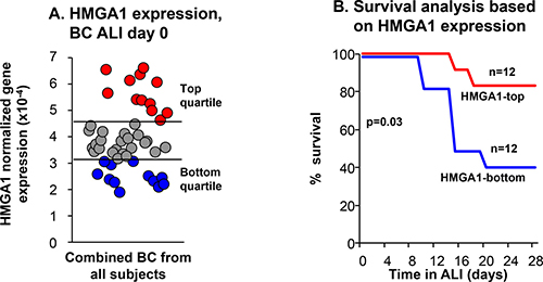 Figure 2: Relationship of BC expression of HMGA1 to the ability of SAE BC to differentiate. Primary BC purified from human SAE sampled by bronchoscopic brushing of 47 individuals (17 nonsmokers, 14 healthy smokers and 16 COPD smokers). (A) HMGA1 expression evaluated by TaqMan at day 0 before differentiation on ALI culture (see Methods, BC-1 and ALI-1). Based on the data in panel A, samples were categorized as “top HMGA1” expressors (HMGA1 expression highest quartile, n = 12), and “bottom HMGA1” expressors (HMGA1 expression lowest quartile, n = 12). The data was normalized to 18S rRNA. (B) Kaplan–Meier survival analysis on ALI cultures for HMGA1-top and –bottom quartile expressors of all nonsmokers, healthy smokers and COPD smokers in SAE BC samples. p = 0.03, log-rank test.