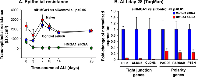Figure 4: Consequences of HMGA1 down-regulation on airway epithelial barrier formation and barrier-related gene expression. BC were transfected with HMGA1 or control siRNA before being placed on ALI culture. Assessment was carried over 28 days. (A) Transepithelial resistance. n = 5, each group. (B) Expression of tight junction and polarity-related genes. Shown is data at day 28 assessed by TaqMan for tight junction protein 3 (TJP3), claudin 3 (CLDN3), claudin 8 (CLDN8), par-3 family cell polarity regulator (PARD3), par-6 family cell polarity regulator β (PARD6B) and phosphatase and tensin homolog (PTEN). Data was normalized to 18S rRNA. Gene expression in control siRNA transfected samples was normalized to 1. n = 5, each group. For A and B, LAE BC from Lonza, see Methods, BC-1 and ALI-1.