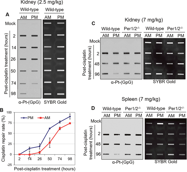 Figure 1: Immuno-slot blot analysis of cisplatin repair by time of day in C57BL/6 mouse tissues. (A) C57BL/6 wild-type mice kept under LD12:12 cycle were injected with 2.5 mg/kg of cisplatin (i.p.) either in the morning (7 AM, ZT0) or evening (7 PM, ZT12). Mice were sacrificed and kidney and spleen tissues were collected at different times between 2 and 98 hours after treatment, and snap frozen for storage and further processing. Genomic DNA was isolated and probed for levels of cisplatin-DNA adducts with an α-Pt-(GpG) antibody in a slot-blot experiment. SYBR Gold was used as an internal control. (B) Cisplatin-DNA adduct repair was quantified from experiments performed as in (A). Error bars represent means ± SD (n=2 mice at each time point with a total of 24 mice). C57BL/6 wild-type mice were compared to genetically circadian-disrupted Per1/2-/- mice in the levels of cisplatin-DNA adducts in the kidney (C) and spleen (D) after 7 mg/kg cisplatin treatment in the morning (7 AM, ZT0) or evening (7 PM, ZT12).