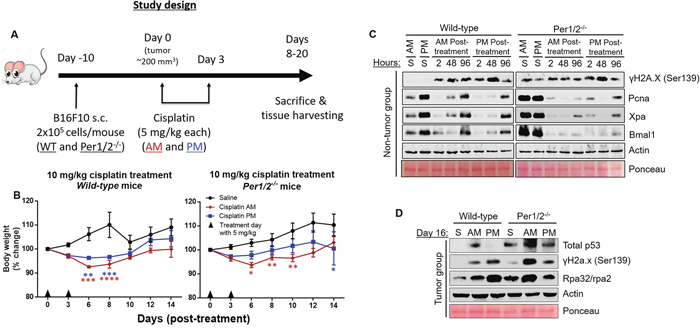 Next, we investigated how the temporal modulation of cisplatin therapy affects its toxicity in a B16F10 melanoma mouse model. Our model in Figure 2A shows the timeline for this experiment. We injected B16F10 melanoma tumor cells (2 x 105 cells/mouse) subcutaneously into the lower right flank region of wild-type and Per1/2-/- mice. These cells began to form visible tumors 1 week after injection. On day 0, when tumor sizes were an average of 200 mm3 (~10 days post-injection), both wild-type and Per1/2-/- mice were subdivided randomly into three treatment groups: saline, cisplatin treatment at ZT0 (morning), or cisplatin treatment at ZT12 (evening). A 5 mg/kg dose of cisplatin was administered on days 1 and 3, and whole-body weight, used as a measure of toxicity, was recorded before each treatment and then on days 6, 8, 10, 12 and 14 after the first dose. Figure 2B shows that in wild-type mice, relative to the saline-treated group, there was a greater decrease (p<0.05) in body weight in the morning-treated group compared to the evening-treated group on days 6 and 8. Further, through the 14 days, body weights showed better recovery in the evening-treated group compared to the morning-treated group. Even with a higher dose treatment of 21 mg/kg of total cisplatin (7 mg/kg three times), the evening-treated wild-type mice exhibited overall better body weight recovery (Supplementary Figure 2A). These data are consistent with better repair of DNA damage and less toxicity in mice that received evening treatment of cisplatin (Figure 1).