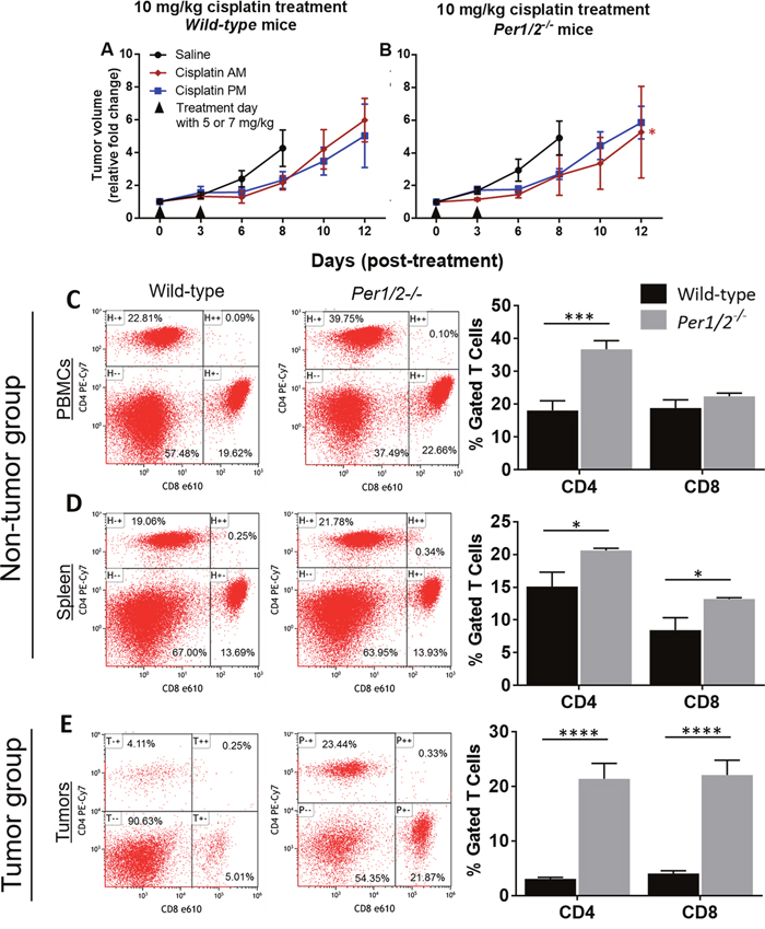 After observing that the Per1/2-/- mice had better cisplatin treatment efficacy against melanoma tumors with both low and high doses, we sought to identify underlying contributing factors. Melanoma tumor cells express antigens that are recognizable by the host CD8+ T cells, which kill tumor cells, and whose induction and recruitment are mediated by CD4+ helper T cells [10, 41, 42]. We performed a separate experiment aimed to identify immune response to melanoma tumors in the wild-type and Per1/2-/- mice. We had a non-tumor (control) group and a melanoma tumor (experimental) group without cisplatin treatment. The animals were sacrificed 15 days after injection of B16F10 melanoma tumor cells, and tumor volumes showed no significant difference between the wild-type and Per1/2-/- groups (data not shown). In the non-tumor mice, cell phenotyping by flow cytometry revealed that the gated CD4+ T cell population was significantly higher in circulating blood and spleen tissues (2.0- and 1.4-fold increases, respectively), whereas the CD8+ T cell population was significantly higher only in the spleen tissues (1.6-fold increase) of Per1/2-/- mice compared to wild-types (Figures 3C-3D). In the tumor-bearing mice, tumor-infiltrating lymphocytes were significantly higher in Per1/2-/- mice than in wild-type mice, with a 6.9-fold and 5.4-fold increase for CD4+ and CD8+ T cell populations, respectively (Figure 3E). Collectively, the more robust CD4+ and CD8+ T cell populations and infiltration to tumor sites of the Per1/2-/- mice suggests that clock-regulated immune function plays an important role in sensitizing melanoma tumors to cisplatin treatment.