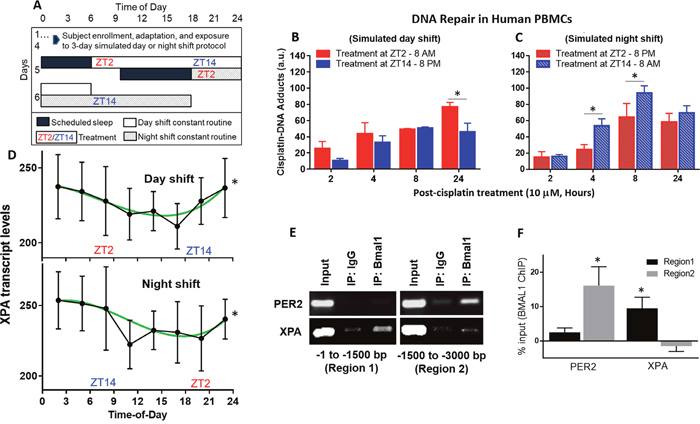 Figure 4: Repair of cisplatin-DNA adducts by time of day in human blood samples. (A) Healthy human subjects were studied in-laboratory and subjected to 3 days of a simulated day shift schedule (B, control condition) or a simulated night shift condition (C, experimental condition). This was followed by a 24-hour constant routine protocol during which blood was drawn at 3-hour intervals (ZT2, ZT5, etc.) Blood samples collected at ZT2 and ZT14 (8 AM and 8 PM, respectively, in the day shift condition, or 8 PM and 8 AM in the night shift condition) were immediately treated with 10 μM cisplatin. Blood samples were incubated and fractions were collected between 2 and 24 hours later to isolate PBMCs. Genomic DNA was purified and probed for cisplatin-DNA adduct levels with an α-Pt-(GpG) antibody using a slot-blot assay. (D) mRNA was isolated from the blood samples and gene expression for XPA, the rate-limiting factor in NER, was analyzed using the NanoString multiplex assay. (E) DNA-protein interaction between the Bmal1 and XPA is shown in the first 3,000 base pair promoter region of human melanoma SKMEL-27 cells using a ChIP assay. PER2 is a circadian clock positive control. Input and IgG are experimental positive and negative controls, respectively. (F) Quantitation of Bmal1 binding to promoter regions of PER2 and XPA from ChIP assay, indicating regions of significance after IgG binding subtraction. Statistical analysis was done using two-way ANOVA with n=3 subjects per group (B-C) and cosinor analysis with n=7 subjects per group (D), and t test with n=3 replicates for E-F. *=p<0.05 for circadian rhythmicity or ChIP binding. Error bars = S.E.M.
