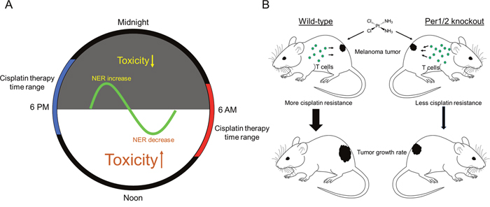 Figure 5: Models showing the impact of the circadian clock on cisplatin toxicity and tumor shrinkage efficacy for melanoma tumors. (A) The rhythmical activity of NER in different tissues is an underlying mechanism responsible for chronotherapeutic outcomes in mouse models and human subjects. (B) There is improved efficacy of cisplatin therapy with a more robust immune system as found in Per1/2-/- mice, probably due to less cisplatin resistance within tumors.