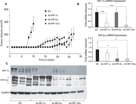 Figure 1: (A) Growth characteristics of tumor xenografts derived from genetically engineered 231-EV (n = 9, diamond), sh-HIF-1α (n = 10, triangle), sh-HIF-2α (n = 9, square) and sh-HIF-1/2α (n = 7, dot) cells. Growth curves were generated by averaging the tumor volume of mice in each group. (B) RT q-PCR analysis showing HIF-1α and HIF-2α mRNA expression levels in 231-EV (n = 8), sh-HIF-1α (n = 10), sh-HIF-2α (7-8) and sh-HIF-1/2α (n = 5) tumors. Values represents Mean fold induction ± SEM of the ∆Ct Values. P-values less than 0.05 were considered significant. *p ≤ 0.05, *** p ≤ 0.0005. (C) Representative immunoblots showing HIF-1α and HIF-2α levels in 231-EV, sh-HIF-1α, sh-HIF-2α and sh-HIF-1/2α tumors. GAPDH was used as a loading control in the western blots.