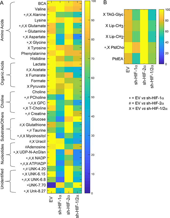 Figure 4: Metabolic heat maps representing the differences in the metabolic profile of tumors. Heat maps were generated from quantitative analysis of high-resolution one dimensional 1H MR spectral data from (A) the aqueous phase and (B) the lipid phase of 231-EV, sh-HIF-1α, sh-HIF-2α and sh-HIF-1/2α tumor extracts. Heat maps were created using MATLAB software (MATLAB R2012b, MathWorks) to visualize the metabolic patterns. Due to the high dynamic range of metabolites, we normalized the highest intensity of a metabolite in each of the four groups to 100%. This normalization provides a dynamic range between 0 - 100%, allowing a better presentation of heat maps. The heat map represents average measurements of multiple replicates per group (231-EV: n = 9, sh-HIF-1α: n = 10, sh-HIF-2α: n = 9, and sh-HIF-1/2α: n = 7). The integral area under the peak was normalized to weight and volume of the sample. TSP dissolved in D2O was used as a quantitative reference in the spectral analysis. Unpaired student’s t-test was applied to measure statistical significance. (*p value < 0.05 for 231-EV vs sh-HIF-1α; #p value < 0.05 for 231-EV vs sh-HIF-2α; xp value ≤ 0.05 for 231-EV vs sh-HIF-1/2α). UDP-N-AcGlsn: UDP-N-Acetyl-Glucosamine.