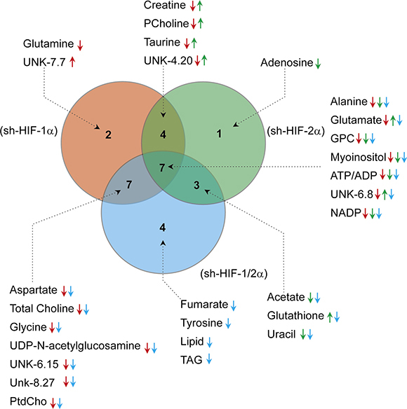 Figure 6: Venn diagram summarizing the commonality and directionality of changes in sh-HIF-1α (red), sh-HIF-2α (green), and both sh-HIF-1/2α (blue) tumors compared to 231-EV tumors, created using web based software Venny 2.1.0 (BioinfoGP at Spanish National Biotechnology Centre (CNB)-CSIC). Numbers of metabolites highlighted in each circle were specific to the respective silenced group. Metabolites that changed in both groups are highlighted in the corresponding overlapping region. The metabolites are listed together with arrows to represent significant increase (up) or decrease (down) in the corresponding groups (red: 231-EV vs sh-HIF-1α; green: 231-EV vs sh-HIF-2α; blue: 231-EV vs sh-HIF-1/2α).