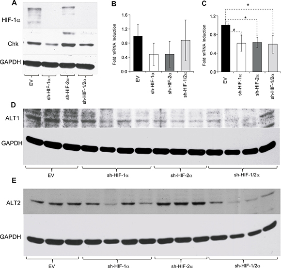 Figure 7: (A) Representative western blots showing choline kinase (Chk) expression in tumors derived from empty vector and HIF-silenced cells. Bar plots represents (B) alanine aminotransferase 1 (ALT1) and (C) alanine aminotransferase 2 (ALT2) mRNA expression levels in tumor xenografts. Values represent mean fold induction ± SEM of the ∆Ct values from 231-EV (n = 9), sh-HIF-1α (n = 10), sh-HIF-2α (n = 8) and sh-HIF-1/2α (n = 6) tumors. (D) and (E) Western blots of ALT1 and ALT2 expression in tumors derived from empty vector and HIF-silenced cells. GAPDH was used as a loading control in the western blots. # p = 0.08; p < 0.05.