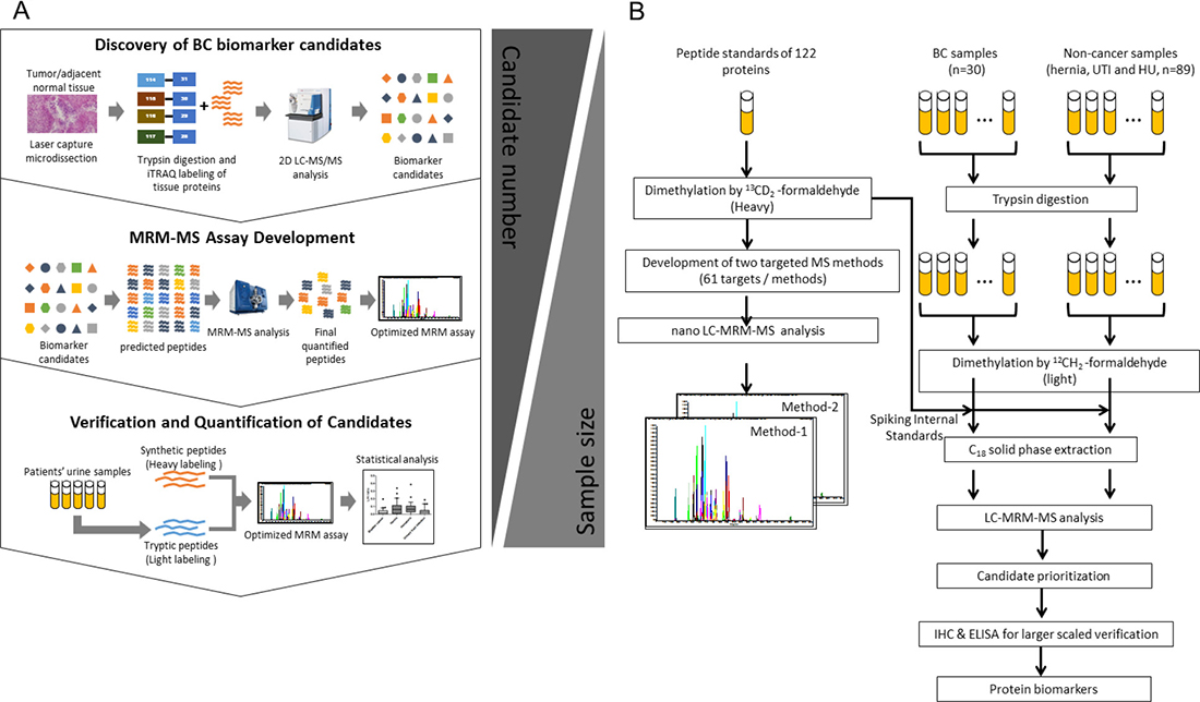 In our previous work [18], we discovered 130 up-regulated BC tissue proteins using a strategy that combined laser microdissection, isobaric tags for relative and absolute quantitation labeling (iTRAQ), and liquid chromatography-tandem MS (LC-MS/MS) analysis to profile proteomic changes in fresh-frozen bladder tumor specimens. Among these BC biomarker candidates, many have not been verified systematically in additional clinical specimens. In the current study, we extended the methodological verification of these 130 biomarker candidates by establishing a detection workflow using isotopic dimethyl labeling coupled with MRM-MS. The proteins that showed elevated concentrations in BC urine, representing potential non-invasive biomarkers, were further verified in additional urine specimens using ELISAs. Expression of the verified protein biomarker candidates in tissue specimens was also tested by immunohistochemistry (IHC) to confirm their bladder cell origin.