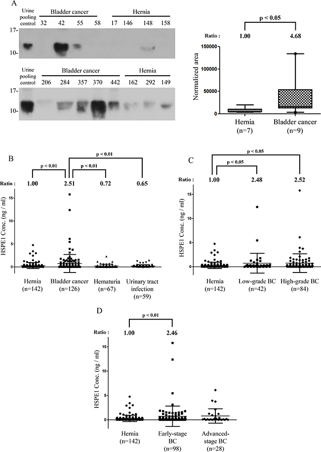Urine specimens from age-matched patients with non-cancerous urological diseases, including hernia, UTI and hematuria, were selected as controls for biomarker methodological verification in urine. The concentrations of candidate proteins in urine samples of controls and cancer patients were measured using a commercial ELISA kit (CSB-E09917h; Cusabio, Hubei, China). The urinary concentration of HSPE1 was measured according to the respective manufacturer’s instructions using 100 μl of 2-fold dilutions of raw urine specimens for each well. Fluorescence was measured with a SpectraMax M5 microplate reader (Molecular Devices, Sunnyvale, CA, USA) using excitation and emission wavelengths of 355 and 460 nm, respectively.