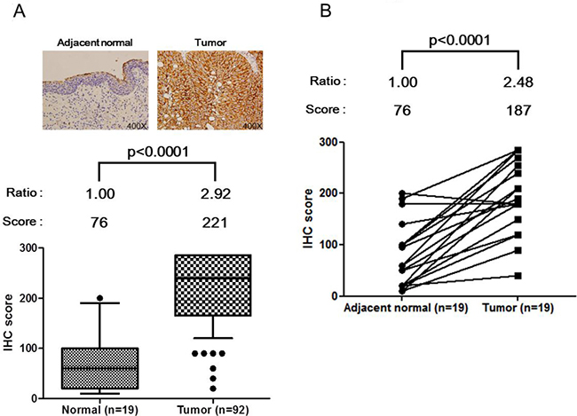 The main function of the bladder is the collection, temporary storage, and expulsion of urine. Bladder tumor frequently occurs in the urothelium layer of urinary bladder. Urine is a proximal fluid for the bladder, thus we expect that the secretory proteins of bladder tumor tissue may secrete or release to urine, resulting in the elevated concentrations in urine. In our previous study of the bladder tissue proteome [18], we isolated tumor tissue and adjacent non-tumor tissue cells from four individual BC patients for comparison by a strategy combining laser capture microdissection (LCM), iTRAQ, and LC-MS/MS. These proteomic analyses [18] revealed that 130 candidates were up-regulated (tumor/non-tumor [T/N] ≥ 1.5) in at least 50% of BC patients. In this study, we planned to perform the methodological verification of these novel tissue biomarkers in a medium-scale of clinical urine and tissue specimens. The verified protein biomarker candidate will be used for large-scale validation work in the future.