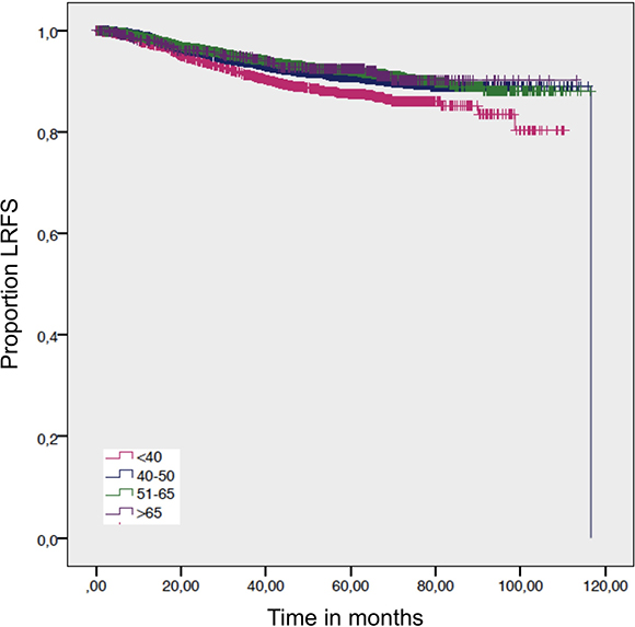 Women >65 years had a significant better LRFS than women between 40-50 years and women <40 years (Table 2; Figure 1).
