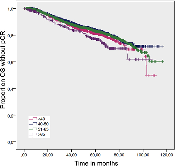 pCR is strongly associated with better OS in all age groups (Figure 6). There were no significant differences between age >65 years and other age groups if pCR was achieved.