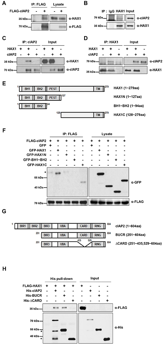 Figure 1: HAX1 interacts with cIAP2. (A) FLAG-cIAP2 protein was expressed in HEK293T cells and immunoprecipitated with anti-FLAG M2 antibody-conjugated agarose beads. The immune complexes were analyzed by immunoblotting with anti-HAX1 antibody and anti-FLAG antibody. (B) The lysates from MDA-MB-231 cells were incubated with IgG or anti-HAX1 antibody, and the immune complexes were analyzed by immunoblotting with anti-cIAP2 antibody and anti-HAX1 antibody. (C,D) Mixtures containing purified HAX1 protein or/and cIAP2 protein were immunoprecipitated with anti-cIAP2 antibody (C) or anti-HAX1 antibody (D), and then the immune complexes were analyzed by immunoblotting with anti-cIAP2 antibody and anti-HAX1 antibody. (E) Schematic diagram of various HAX1 deletion mutants. BH; Bcl-2 homology domain, PEST; proline (P), glutamic acid (E), serine (S), and threonine (T)-enriched sequence domain, TM; transmembrane domain. (F) FLAG-cIAP2 protein was expressed with various GFP-HAX1 deletion mutants in HEK 293T cells. FLAG-cIAP2 was precipitated with anti-FALG M2 antibody-conjugated agarose beads and then anti-GFP antibody and anti-FLAG antibody were used to detect HAX-1 mutants and cIAP2. Asterisk indicates nonspecific bands. (G) Schematic diagram of various cIAP2 deletion mutants. (H) After purified FLAG-HAX1 protein was incubated with various His-cIAP2 proteins, His-cIAP2 proteins were subjected to Ni-NTA column to pull down the protein complexes. The resulting complexes were analyzed by immunoblotting with anti-His and anti-FLAG antibodies. Asterisks indicate nonspecific bands.