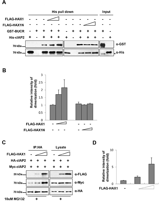 Figure 4: HAX1 facilitates the dimerization of the cIAP2 RING domain. (A) Mixtures containing purified His-cIAP2 and GST-BUCR proteins were incubated with increasing amounts of HAX1 or HAX1N proteins and then examined by the His-pull down assay. Briefly, proteins were immunoprecipitated with Ni-NTA agarose resin and the resulting complexes were analyzed by immunoblotting with anti-His and anti-GST antibodies. (B) Quantitation of the results from (A). Data are presented as mean ± SEM (error bars) of three independent experiments. (C) HA-cIAP2 and Myc-cIAP2 proteins were expressed with increasing amounts of FLAG-HAX1 in HEK 293T cells. After 24 h, the cells were treated with or without a proteasome inhibitor, MG132 (10 μΜ), for an additional 7 h and cell lysates were immunoprecipitated with anti-HA agarose. The resulting complexes were analyzed by immunoblotting using appropriate antibodies. (D) Quantitation of the results from (C). Data are presented as mean ± SEM (error bars) of three independent experiments.